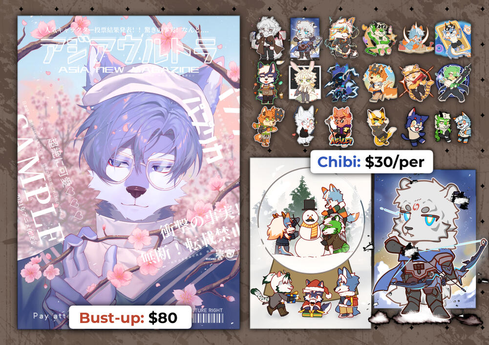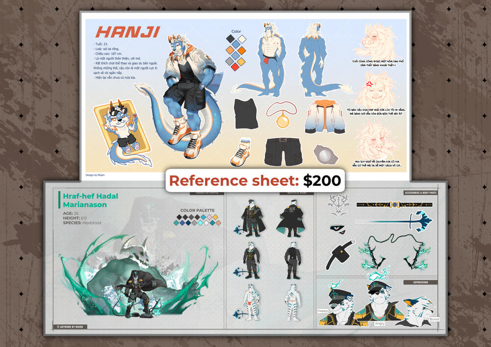 - Contains 1 splash art, a pair of fullbody with front and back views, and character's details. - 3 items at max. Extra items: $5/each - 3 expressions at max. Extra expressions: $5/each - Extra pairs of fullbody: $30/pair - Outfit design: $50 - NSFW: $30 - Complicated details: $15+ - Complicated background: $20+